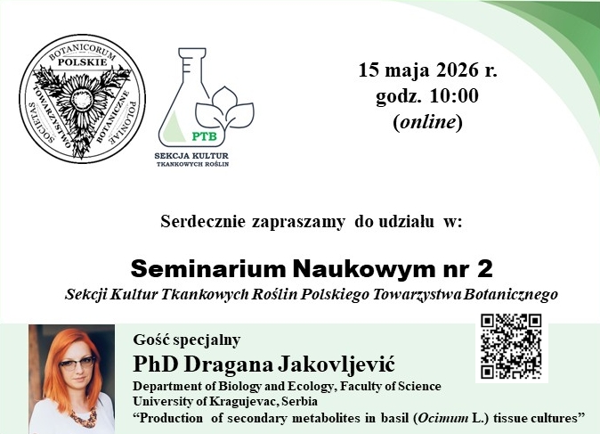 Serdecznie zapraszamy do udziału w w drugim z cyklu Seminarium Naukowym Sekcji Kultur Tkankowych Roślin Polskiego Towarzystwa Botanicznego, które odbędzie się w piątek 15 maja 2026 r. on-line od godz. 10:00.