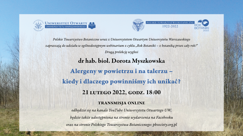 Serdecznie zapraszamy na drugi wykład on-line z cyklu „Rok Botaniki – z botaniką przez cały rok!” który odbędzie się 21 lutego (poniedziałek) 2022 roku o godz. 18.00. Wykład pt.: „Alergeny w powietrzu i na talerzu – kiedy i dlaczego powinniśmy ich unikać?” wygłosi dr hab. Dorota Myszkowska z Zakładu Alergologii Klinicznej i Środowiskowej Collegium Medicum Uniwersytetu Jagiellońskiego oraz z Centrum Alergologii Klinicznej i Środowiskowej Szpitala Uniwersyteckiego w Krakowie.