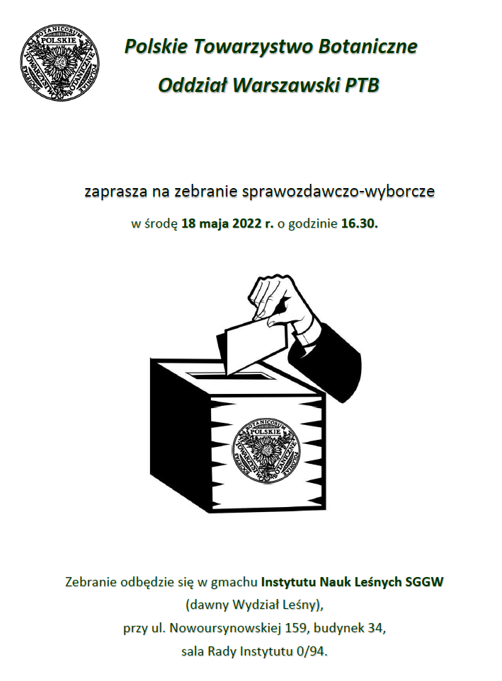 w związku z dobiegająca końca kadencją obecnego Zarządu Oddziału Warszawskiego PTB a także LIX Zjazdem Polskiego Towarzystwa Botanicznego serdecznie zapraszamy członków oddziału na zebranie sprawozdawczo-wyborcze, które odbędzie się 18 maja 2022 r. o godz. 16:30 w gmachu Instytutu Nauk Leśnych przy ul. Nowoursynowskiej 159 (budynek 34, sala 0/94).